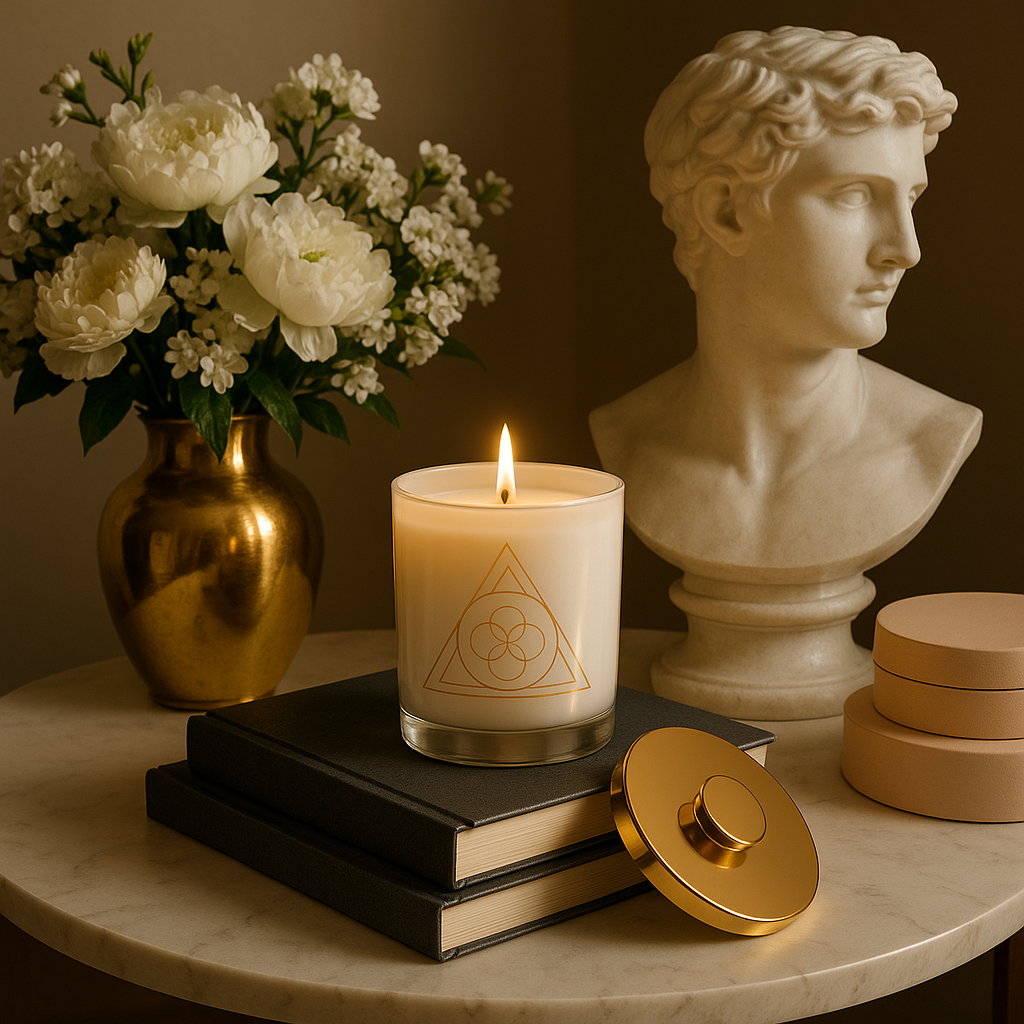 La bougie blanche illumine l’espace de sa lumière douce, tandis que le diffuseur noir libère une profondeur olfactive enveloppante.