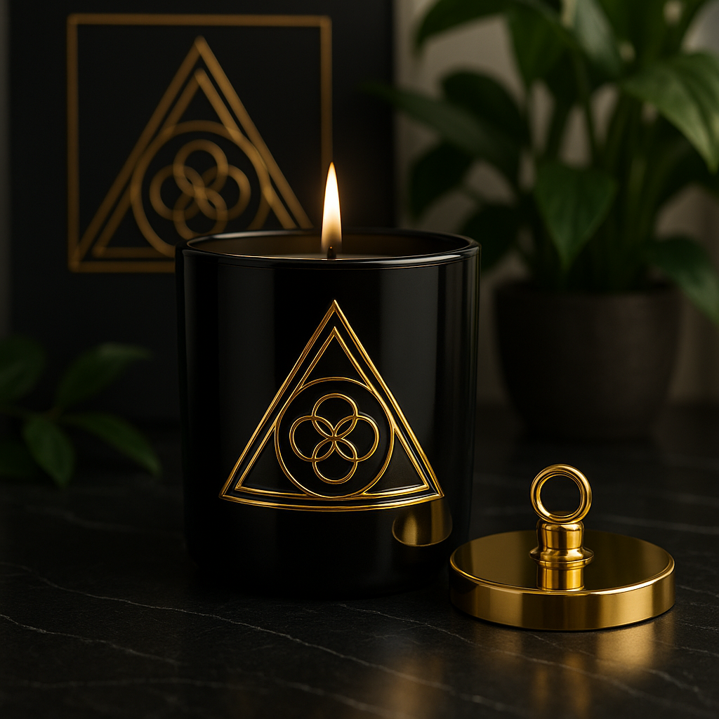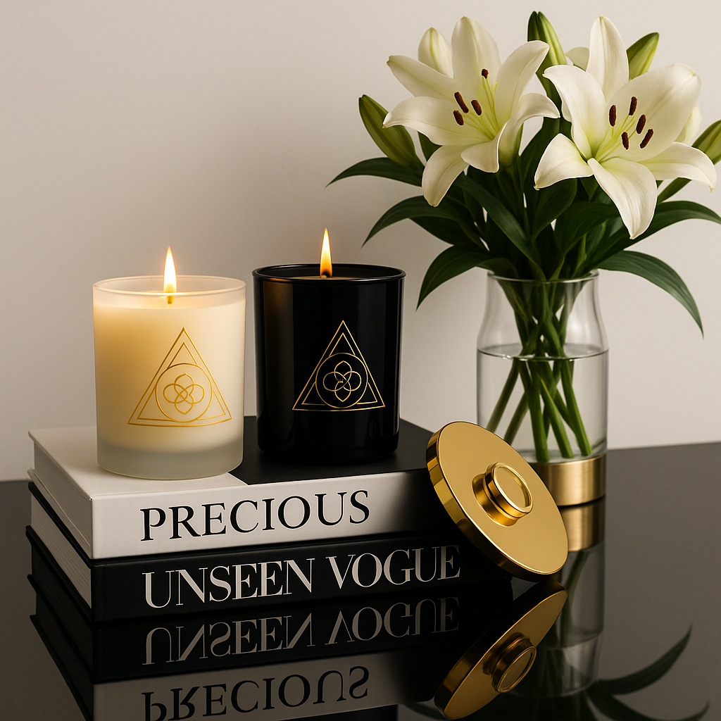 La bougie blanche illumine l’espace de sa lumière douce, tandis que le diffuseur noir libère une profondeur olfactive enveloppante.
